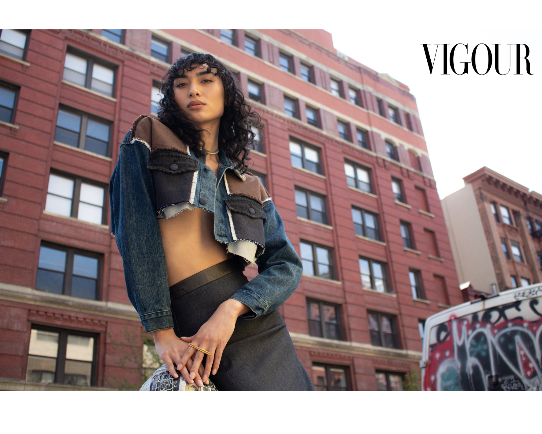 Cet éditorial a été réalisé par le photographe, Reem Al Yafaey, la styliste, Madison Gu ainsi que par le modèle Jules Santiago. Ce qui frappe dans cet éditorial, c’est l’attitude. Le regard est direct, presque défiant. Le corps est ancré, mais jamais figé. Margot VII ne pose pas, elle occupe l’espace. Adossée à la ville, elle en reprend les codes : frontalité, spontanéité, absence de filtre. Pourtant, elle en détourne les règles en y injectant une précision presque couture. La jupe Nana, dans ce contexte, devient une armure douce. Une pièce qui protège sans enfermer, qui affirme sans rigidifier. Avec cet éditorial, Vigour continue de brouiller les frontières entre mode et réalité. Il ne s’agit plus de créer un univers idéalisé, mais de révéler la beauté dans ce qui existe déjà dans les imperfections, les aspérités, les contrastes. Le décor n’est pas un fond, c’est un acteur. Et Margot VII s’y inscrit avec une justesse presque instinctive. Les jeux de perspective angles bas, lignes ascendantes des bâtiments amplifient la présence du corps. La silhouette devient monumentale sans perdre sa fluidité.