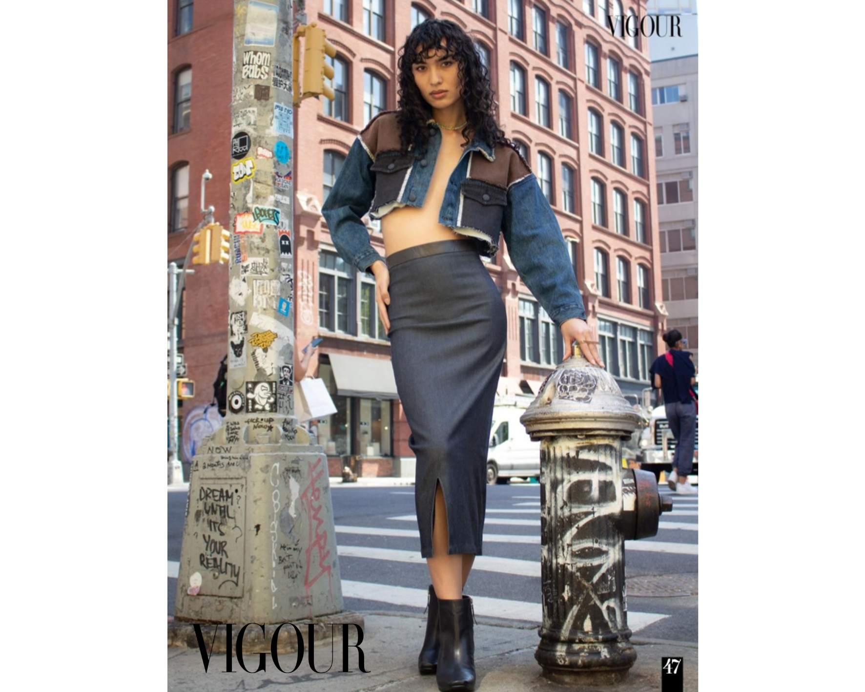 Ce qui reste, au-delà des images, c’est cette sensation de maîtrise tranquille. Rien n’est excessif, rien n’est démonstratif et pourtant, tout marque. La jupe Nana n’a pas besoin de s’imposer : elle existe avec évidence, tout comme la Blouse Luz en Jean. Elle structure, elle accompagne, elle révèle. Margot VII, elle, incarne cette génération qui n’a plus besoin de choisir entre force et élégance. Elle conjugue les deux, naturellement. Dans les pages de Vigour, cette rencontre devient une évidence visuelle : celle d’une mode ancrée dans le réel, mais toujours tournée vers une forme d’élévation. Ce n’est pas seulement une série d’images, c’est une empreinte. Une manière de penser la silhouette dans son environnement, de faire dialoguer vêtements et espaces, corps et architecture. Avec la jupe Nana, Margot VII redéfinit les contours de l’allure contemporaine : précise, libre, ancrée et profondément vivante.