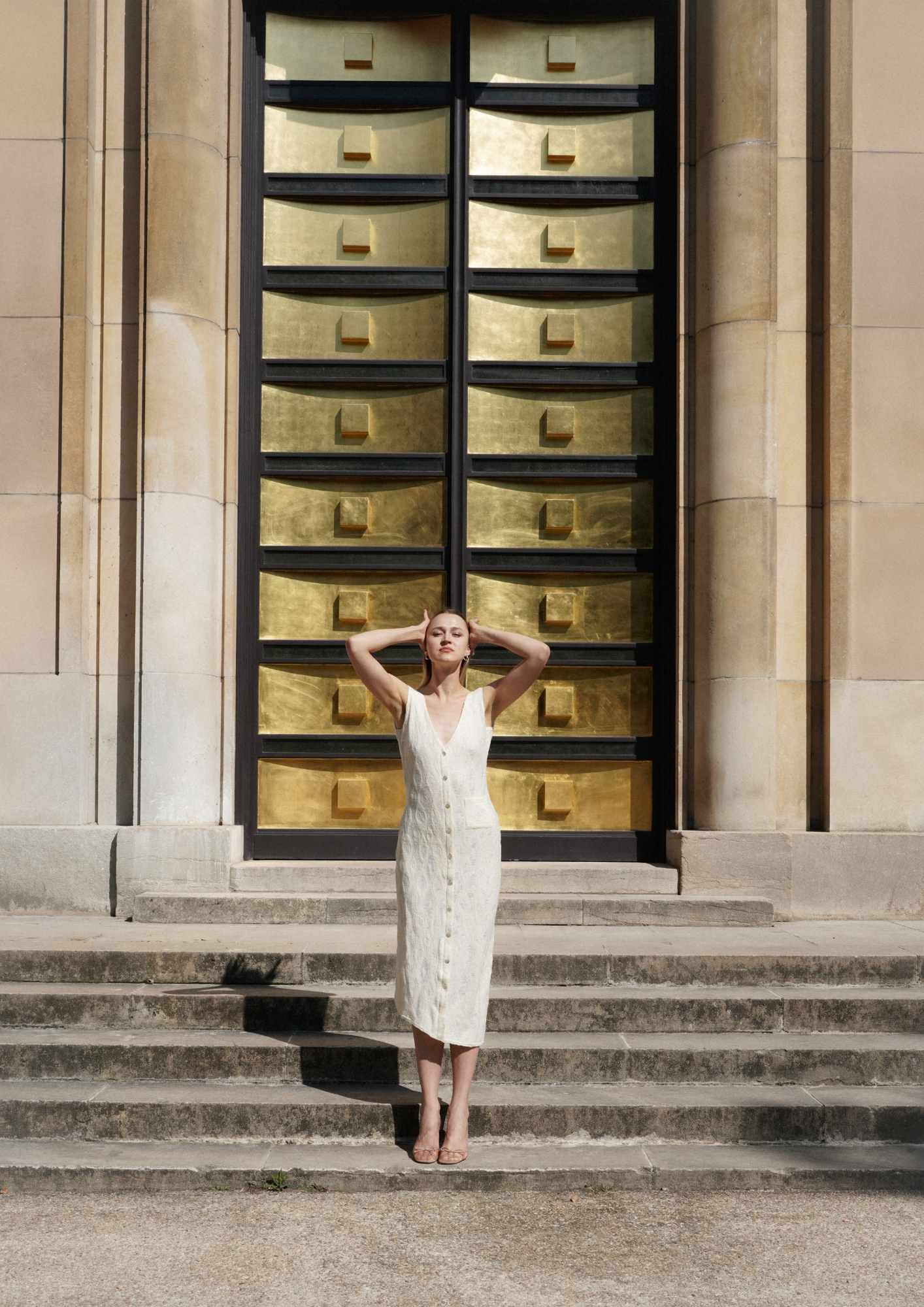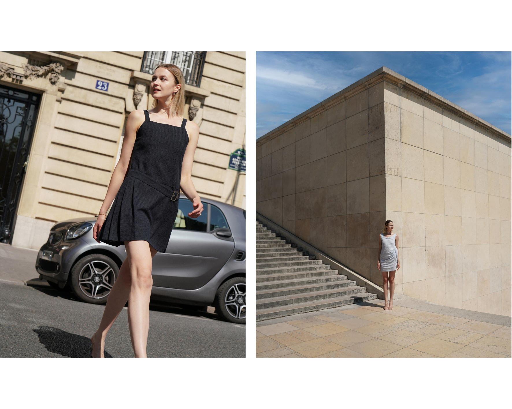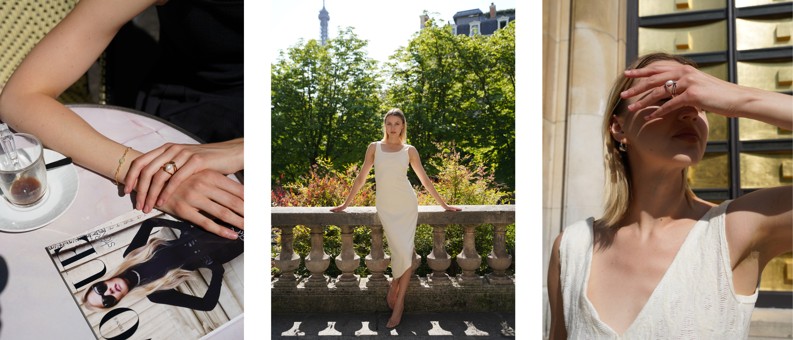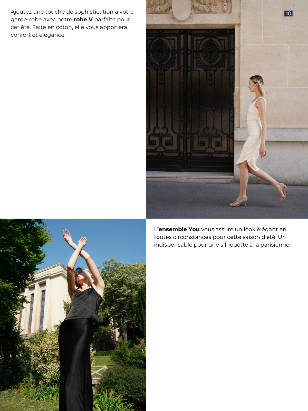 Chaque pièce sélectionnée raconte un fragment de l’été à Paris. La direction artistique mise sur une palette de tons classiques noir, beige, bleu ciel contrastée par des jeux de matières et de volumes. Le minimalisme y est expressif, jamais froid, toujours en mouvement. Les silhouettes dessinent une..