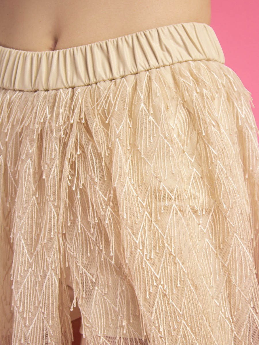 Nos créateurs ont imaginé une tenue facile à porter, confortable et élégante. Nous avons décidé d'utiliser un coton de qualité que nous avons marié à une dentelle ultra raffinée sur tulle. C'est un élégant jeu de transparence qui montre beaucoup sans jamais rien dévoiler ! La jupe est, en effet, proposée avec un short tout simple qui se dissimule sous le jupon ultra long et fendu.