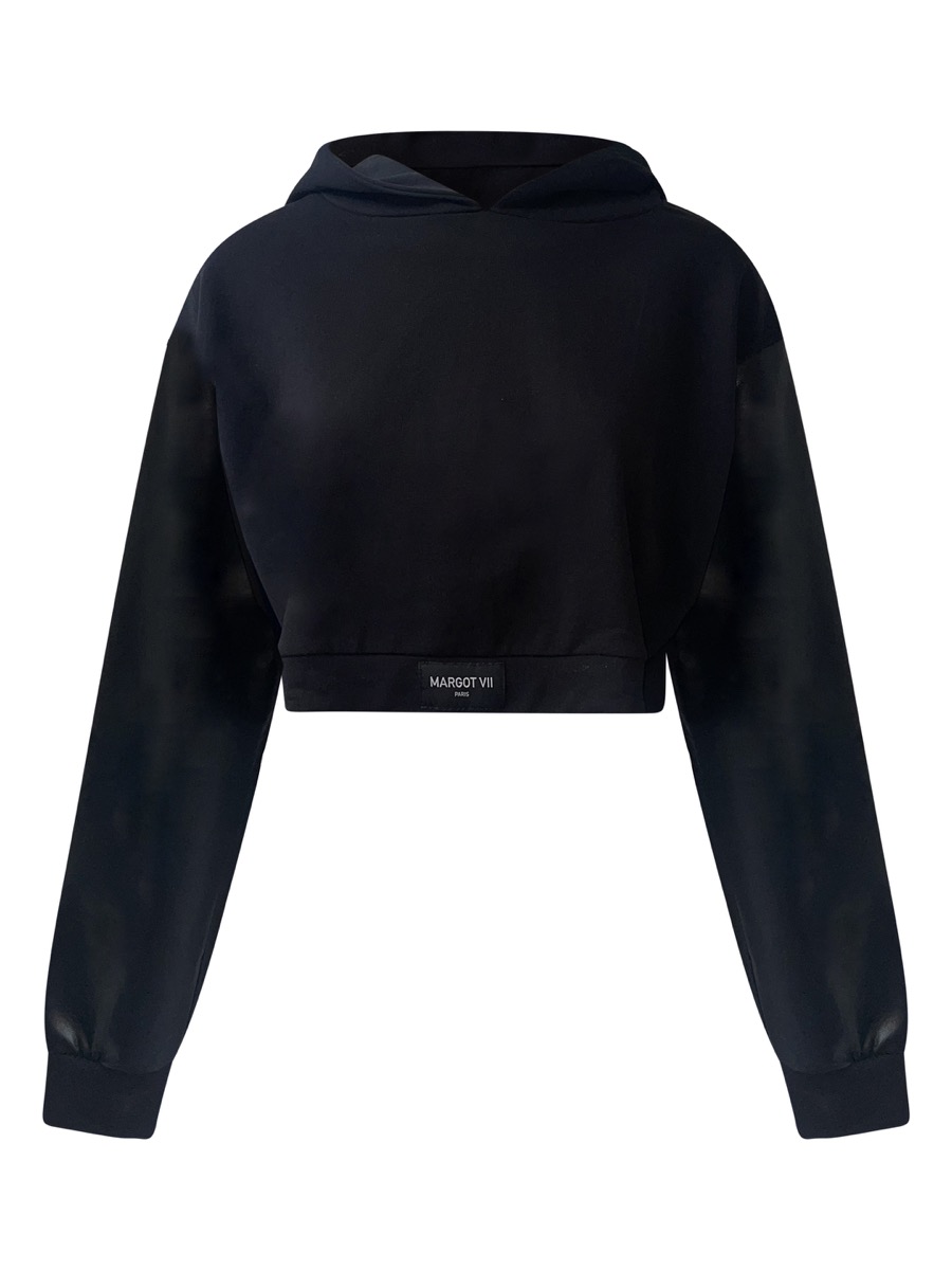 Notre sweat a aussi eu les faveurs de la styliste. Il apporte une note très décontractée à une jolie jupe courte inspirée par le style écolière. La styliste a joué sur le duo gagnant noir et rouge pour créer un look à la fois très sage et totalement original. Il est vrai que notre sweat MV a un design parfait. Une coupe XXL, une capuche, évidemment, et un joli jeu de matières (faux cuir et molletonné très douillet) en font un must-have pour qui veut un style actuel sans en faire trop.