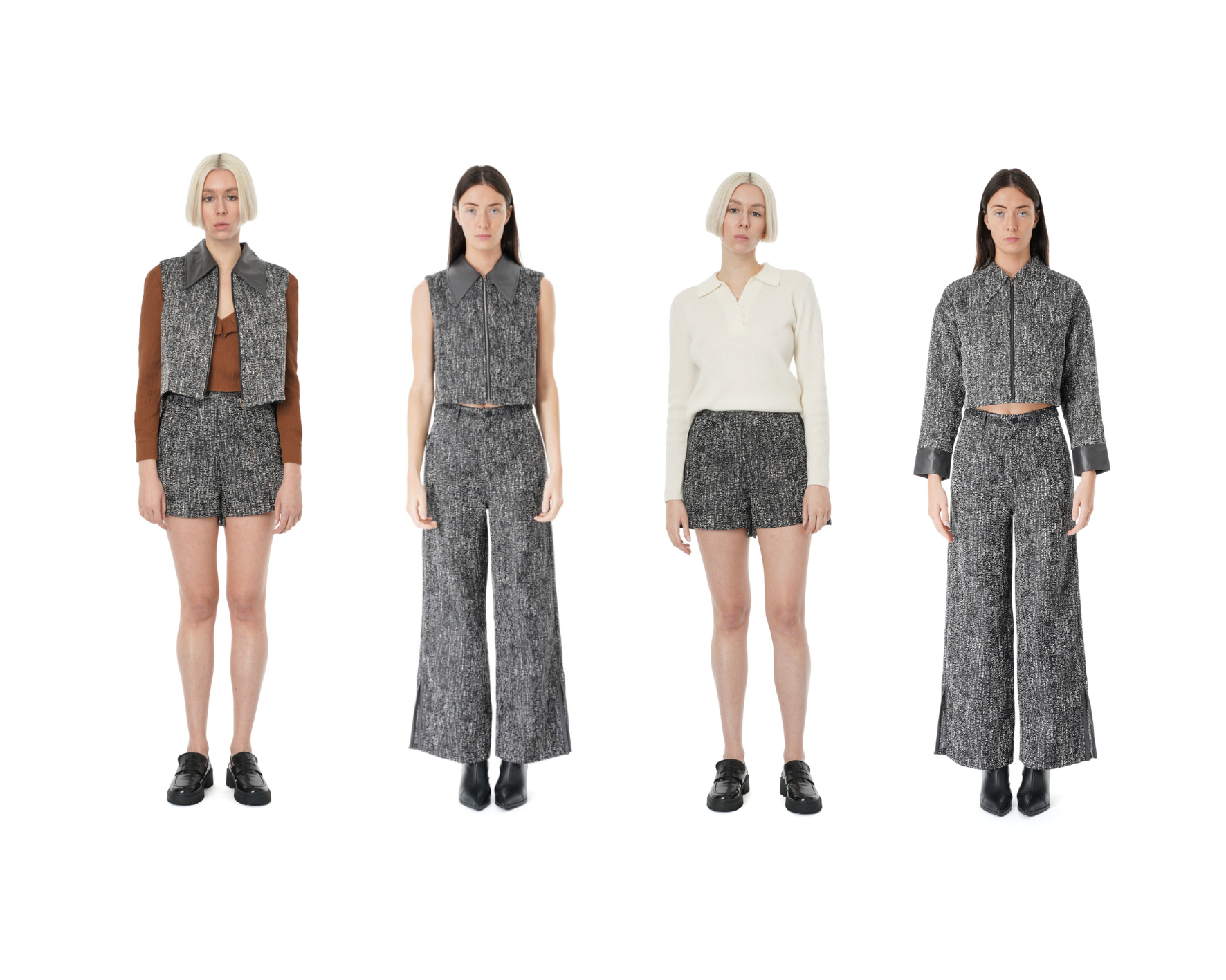Le fil rouge de la collection est sans conteste le tweed, choisi comme matière unique pour l’ensemble des pièces. Ce parti pris audacieux traduit une volonté de simplicité, de cohérence et de responsabilité. Le tweed, souvent associé à l’héritage couture et à la sophistication britannique, trouve ici une nouvelle jeunesse. Léger, confortable et durable, il confère à la collection une texture distinctive et une allure à la fois habillée et décontractée. En s’appuyant sur la matière du tweed et en y ajoutant des détails en similicuir, MARGOT VII va créer une touche moderne et architecturale.