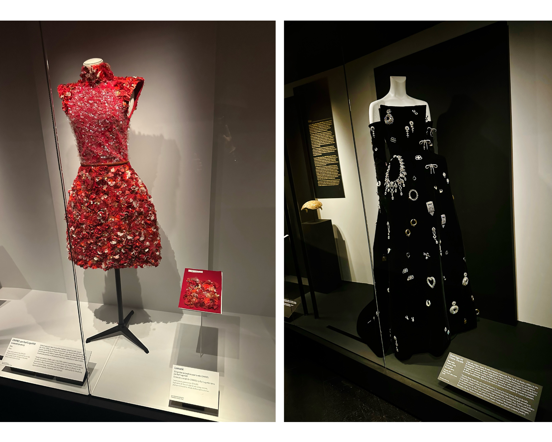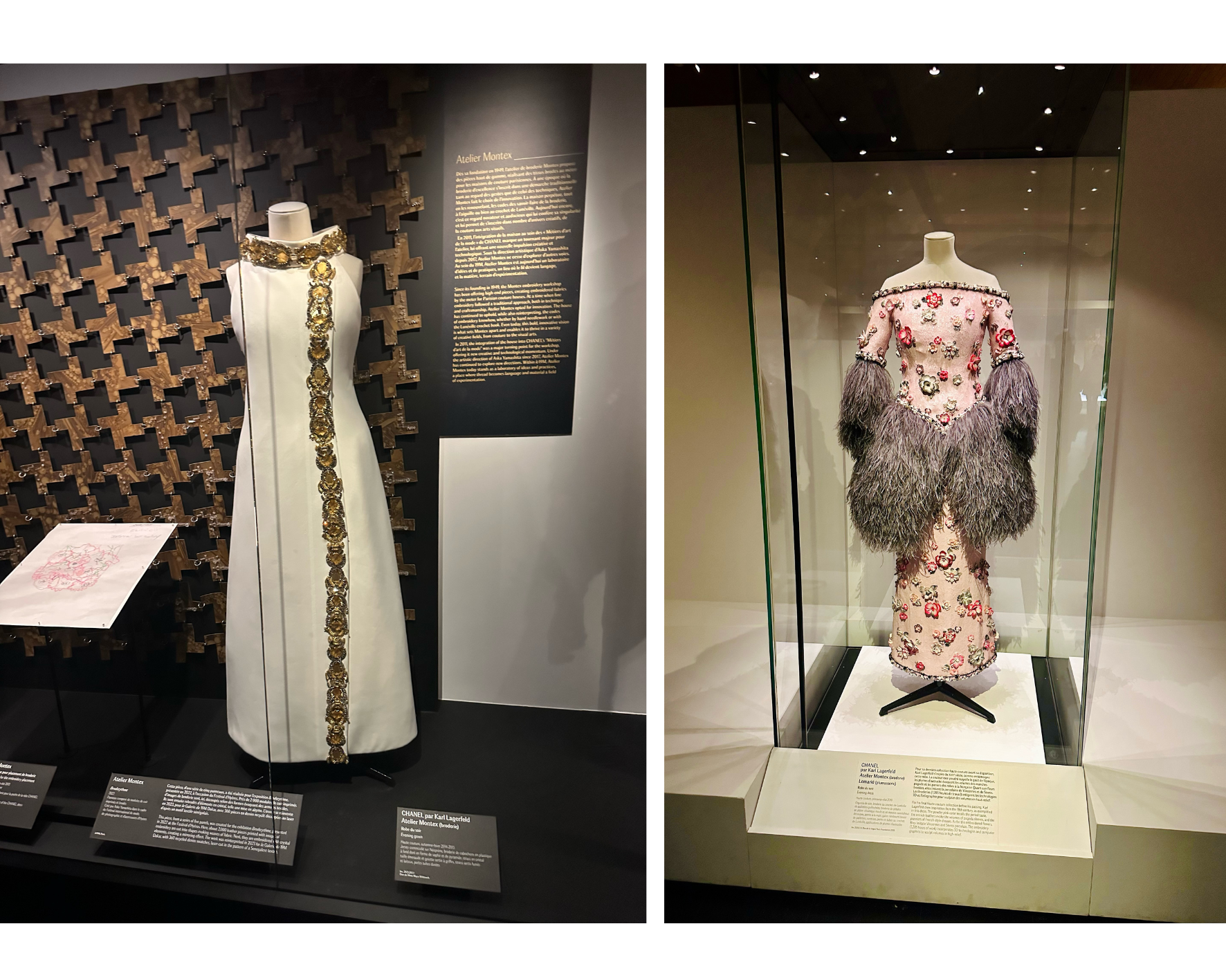 L’exposition établit un dialogue subtil entre héritage et création contemporaine. Les savoir-faire traditionnels ne sont pas figés dans le passé, ils nourrissent au contraire les écritures actuelles. Les techniques anciennes apparaissent comme des fondations vivantes, capables d’accompagner l’innovation sans jamais la contraindre. Créer aujourd’hui, c’est prolonger une histoire, l’interpréter et la faire évoluer. L’exposition choisit de rendre visibles les auteurs des savoir-faire, souvent relégués à l’arrière-plan de l’histoire de la mode. Les silhouettes exposées révèlent une richesse de techniques et de textures où chaque détail compte. Broderies denses, surfaces constellées d’ornements, jeux de reliefs et de volumes témoignent d’un travail d’une précision extrême. Le regard est invité à ralentir, à s’approcher, à observer ce qui ne se perçoit pas immédiatement, rappelant que la création naît d’un temps long et d’une maîtrise patiente.