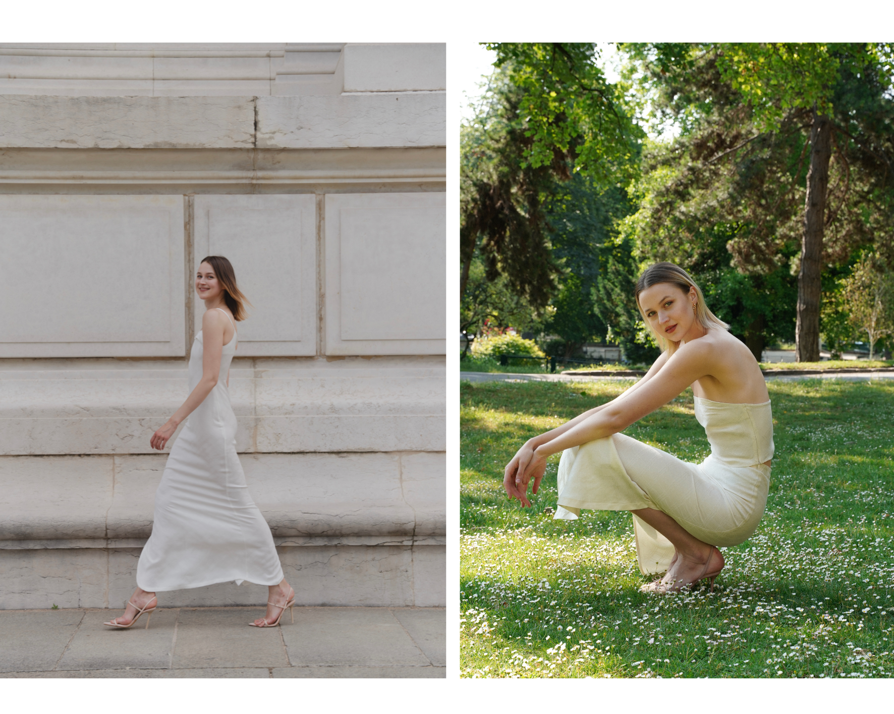 La robe ME se décline en bleu, lila ou beige, comme une variation autour de la douceur et de la lumière. Selon la teinte choisie, elle évoque tour à tour la fraîcheur d’une cérémonie en journée, la délicatesse d’une fin d’après-midi ou la chaleur d’un événement au coucher du soleil. Sa coupe fluide accompagne le mouvement avec naturel, offrant une silhouette à la fois simple et profondément élégante. La robe Ele incarne une approche plus structurée de la féminité. Sa ligne précise dessine une allure nette, presque architecturale, idéale pour celles qui recherchent une présence affirmée sans excès. Elle trouve parfaitement sa place dans des contextes plus formels, tout en conservant une modernité discrète. La robe Lola, quant à elle, joue sur une sensualité maîtrisée. Les volumes y sont plus libres, les lignes légèrement mouvantes, créant une silhouette vivante qui capte le regard sans jamais le retenir. C’est une pièce qui accompagne autant qu’elle révèle. Enfin, la robe SI s’inscrit dans une logique de minimalisme subtil. Derrière son apparente simplicité se cache un travail précis de coupe et de proportion, pensé pour laisser place à l’attitude. Elle devient alors un support, une base élégante à interpréter selon l’instant.