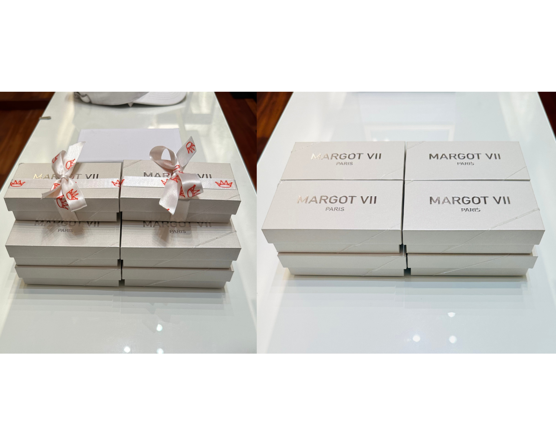 Afin de mettre en place cette collaboration, nous avons allié nos deux univers dans l’intention de proposer une gamme de chocolats représentant l’univers de MARGOT VII en jouant avec les textures et nos différentes créations. Le logo également présent représente le symbole de la marque, il était donc indispensable pour nous de le présenter sur la boîte en elle-même. Différents prototypes ont été proposés et expérimentés, nous avons alors pu convenir de 4 saveurs différentes alliant douceur, minimalisme, originalité et unicité. Chaque chocolats vous transportera dans l’univers de MARGOT VII et de ses créations.