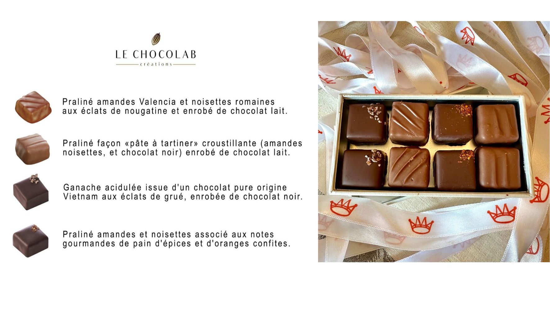 Nichés au creux d'une belle boîte argentée joliment rehaussée d'un ruban au motif de couronne rouge. Vous y trouverez 8 chocolats dont 4 saveurs différentes. Le premier est un délicieux praliné amande et noisette enrobé de chocolat au lait, un classique qui vous permettra de savourer un instant de calme et de tranquillité. Le second est une ganache acidulée accompagnée d’éclats de grué sur le dessus de celui-ci, il ajoutera une touche d’acide et un goût prononcé à vos papilles. Vient ensuite un praliné croustillant qui apportera douceur. Et enfin vous pourrez déguster un praliné amandes et noisettes aux saveurs de pain d'épices et d'orange confites, avec des éclats de noisettes en guise de décorations, qui sauront donner un goût marqué à votre dégustation.
